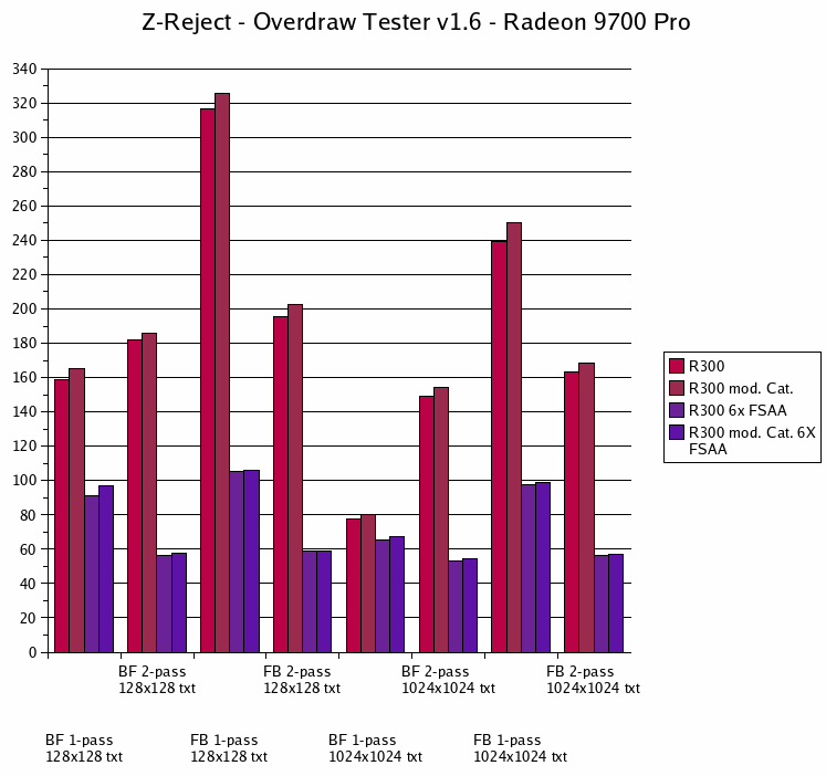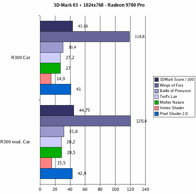 Nun bestätigen Sie die weiteren Dialoge und starten neu. Danach sollten Änderungen im Control Panel sichtbar werden. Control Panel Dies waren unsere ersten Beweise, dass die modifizierte ati2mtag.sys etwas bewirkte. Leistungsunterschiede Fablemark zeigt 4 % Leistungsunterschied. 3D-Mark 03 liefert mit den modifizierten Treibern eine leicht bessere Performance (3-5 %). Dies sind keine Messungenauigkeiten (dachten wir zuerst auch), was durch mehermalige Tests bestätigt wurde. Mit 16x anisotrophen Filtern legt der R350 Treiberpfad nochmals deutlich zu, bis zu 20% Unterschied! Mit 2x FSAA ist der R350 Treiberpfad bis zu 10 % schneller. 4x FSAA sieht es genau wie bei 2xFSAA aus. Wieder sind die Vorteile des modifizierten Treibers zu erkennen. Besonders die Pixel Shader v1.1 sind hier optimiert worden und laufen 40 % schneller. Mit 16x anisotrophen Filter ein ähnliches Bild. Das ATi Island Demo 1 bietet mit seiner Wasseroberfläche einen idealen Härtetest für den anisotrophen Filter. Hier kann der R350 Treiberpfad mit bis zu 19 % davonziehen. Deutlich sind Optimierungen an den DX8 Shadern zu erkennen. Unter DX9 fallen die Unterschiede noch ein wenig größer aus. Die 2.0'er Shader sind ein wenig langsamer als die 1.1 - 1.4'er Shader. Jedoch zeigt der R350 Pfad hier auch Vorteile von bis zu 23 %. Der Z-Reject - Overdraw Tester v1.6 wurde hier mit 128x128 großen Texturen verwendet. BF bedeutet die 3D-Objekte wurden von hinten nach vorne gezeichnet, bei FB genau umgekehrt. So wird die Wirkung von HyperZ deutlich. Maximal 4 % Mehrleistung durch die modifizierten Treiber. Hier wurde dir Füllrate gemessen. Einmal mit kleinen 128x128'er Texturen und einmal mit 1024x1024'er Texturen. Die Leistungsvorteile der modifizierten Treiber liegen bei maximal 7 % bei kleinen und 20 % bei großen Texturen. Die Unreal Tournament 2003 Demo v2206 (mit HardOCP's Tool und max. Details gemessen) zeigt auch geringe Veränderungen. Zwischen 4 % und 9 %. |