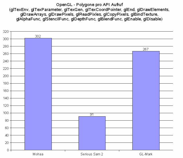 ![]() Die doch recht alte Quake 3 Engine (Mohaa) zeigt, dass sie am wenigsten API Aufrufe pro Polygon verbraucht, GL-Mark ist hier auch nicht viel schlechter. Serious Sam 2 verwendet fast 9x soviele glEnable/glDisable Aufrufe auf die Polygonanzahl gerechnet wie z.B. Mohaa. Ob dies ein Grund für eine schlechtere Performance sein muss, kann ich nicht sagen. Diese Grafik soll auch nur eine grobe Orientierung sein, was innerhalb einer 3D-Engine so alles abläuft. |