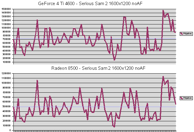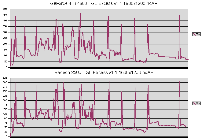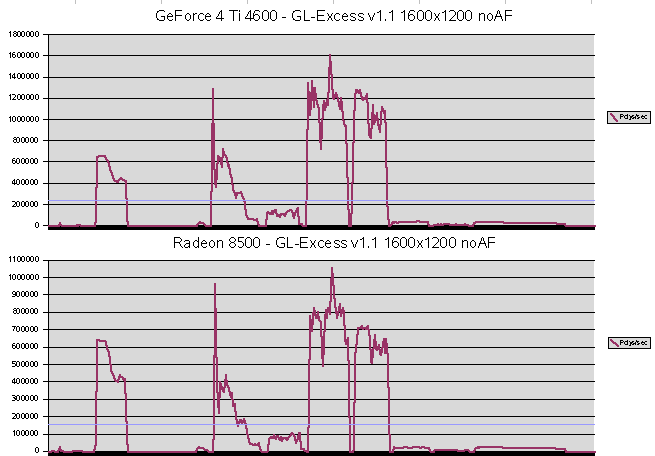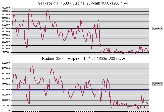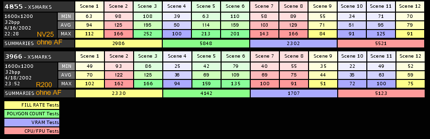GL-Excess Ein klarer Sieg für NVIDIA's GeForce 4 Ti 4600 - bei allen Werten gewinnt sie deutlich. ![]() Die Füllrate und der Polygondurchsatz sinken bei der GeForce 4 Ti 4600 mit aniso. Filtern stark ab. Lediglich bei den VRAM-Tests kann sie dank ihrer Bandbreite die Radeon 8500 schlagen. ![]() Mit ca. 135 FPS ist die GeForce 4 Ti 4600 etwa 50 % schneller als die Radeon 5800 mit 90 FPS. Die maximalen FPS reichen über 450 FPS hinaus, die Radeon 8500 kommt dort nur auf etwas mehr als 300, also auch hier etwa 50% mehr Leistung bei der Karte aus dem Hause NVIDIA. ![]() Bei den Polygondurchsätzen bestätigt sich der Vorsprung. Die GeForce 4 Ti 4600 liegt mit ca. 220000 Polys/Sek in Führung, gefolgt von der Radeon 8500 mit 150000 Polys/Sek. |