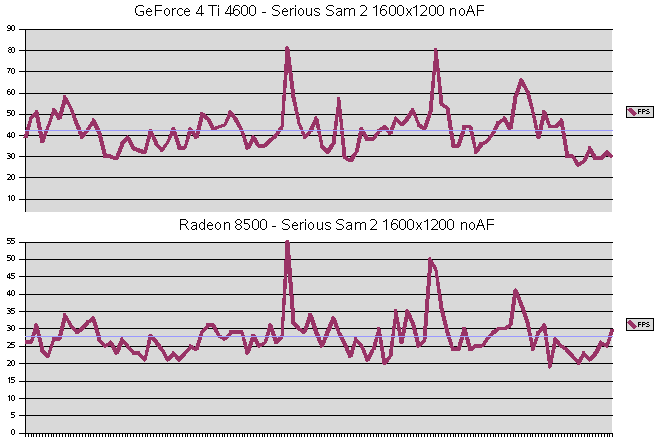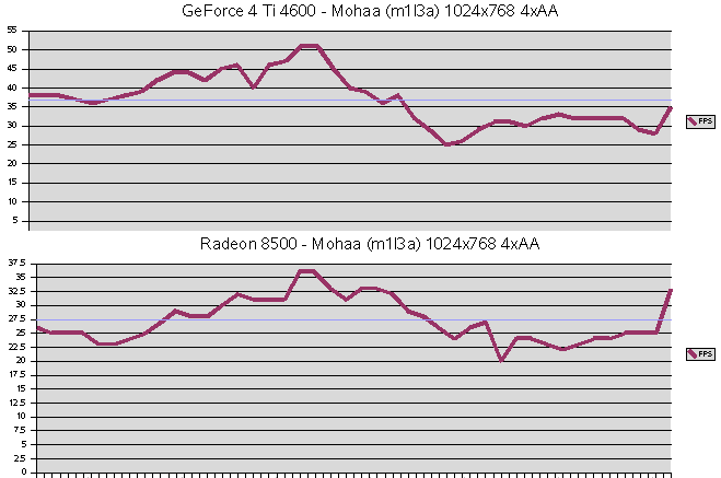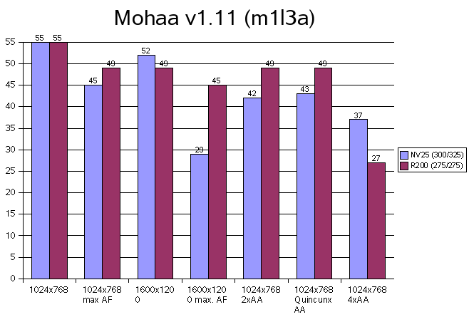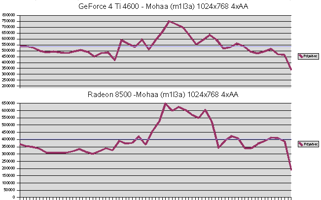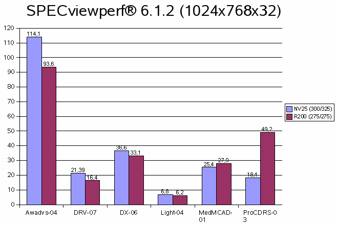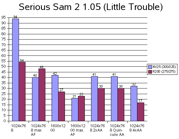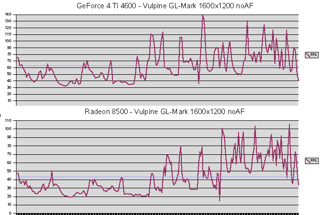 Vulpine GL-Mark![]() Beeindruckende Vorstellung der GeForce 4 Ti 4600, bei 1600x1200x32 63 FPS. Auch das 4xFSAA ist wesentlich schneller, als jenes der Radeon 8500. Leider habe ich vergessen Einzeltests mit aniso. Filtern durchzuführen, bei FSAA ist es jedoch immer aktiviert. ![]() Ähnliche Verläufe beider Karten, jedoch bleibt die GeForce 4 Ti 4600 bei den minimalen FPS über der 30 FP Grenze, die Radeon 8500 vermag dies nicht zu leisten, sie rutscht auf 20 FPS ab, kurz sogar auf 15 FPS. Die GeForce 4 Ti 4600 liegt mit durchschnittlich 2,8 Mio. Polys/Sek deutlich vor der Radeon 8500 mit 1,9 Mio. Polys/Sek. SPECviewperf ![]() Die Treiber beider Karten sind zwar nicht für dieses Marktsegment gedacht und optimiert, trotzdem zeigen die Resultate, welche Treiber für CAD/CAM besser geeignet sind, da es hier kaum auf Bandbreite oder FSAA ankommt. Mohaa (m1l3a) ![]() Dieser Benchmark war CPU Limitiert, was jedoch nicht weiter stört, da man sich bei Spielen die Limiterungen nicht aussuchen kann. Deutlich sieht man wieder die Leistungsverluste der GeForce 4 Ti 4600, sobald aniso. Filter eingesetzt wird. Jedoch zeigen sich auch hier ihre guten FSAA Fähigkeiten, 37 FPS bei 4xFSAA mit max. ansio. Filtern sind deutlich schneller als die Radeon 8500, welche sich trotzdem nicht schlecht schlägt. ![]() Die GeForce 4 Ti 4600 hällt sich bei 4xFSAA über der magischen 25 FPS Grenze, die Radeon erreicht dies nicht, sie sackt auf 20 FPS durch, somit ist ein deutliches Ruckeln zu sehen. ![]() Dieser Level in Mohaa gehört nicht zu den Polygonlastigsten. Die GeForce 4 Ti 4600 ist ein gutes Stück schneller als die Radeon 8500. Serious Sam 2 ![]() Die enorme Leistung der GeForce 4 Ti 4600 ist beeindruckend. Fast doppelt so schnell wie die Radeon 8500, bei 1024x768x32 und 50% schneller bei 1600x1200x32, wenn da nur der Leistungsverlust beim aniso. Filtern nicht wäre. Die FSAA Werte der GeForce 4 Ti 4600 würden wesentlich höher ausfallen, wenn das aniso. Filter deaktiviert wäre. ![]() Hier sieht man, das Welten zwischen den beiden Karten liegen. Die Radeon 8500 kommt gerade mal an die 55 FPS Marke, das ist bei der GeForce 4 Ti 4600 fast schon der Durchschnitt. ![]() Selbst beim minimalen Polygondurchsatz ist die GeForce 4 Ti 4600 mehr als doppelt so schnell wie die Radeon 8500 (153000 zu 73000). OpenGL Game Engines |