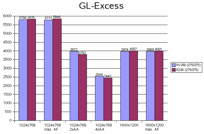GL-Excess ![]() Keine deutlichen Unterschiede beider Karten. ![]() Die detailierten Werte zeigen ebenfalls kaum Unterschiede. Lediglich bei den grünen Weten (Polygondurchsatz) liegt die Radeon 8500 ab und an ein wenig vorne. |