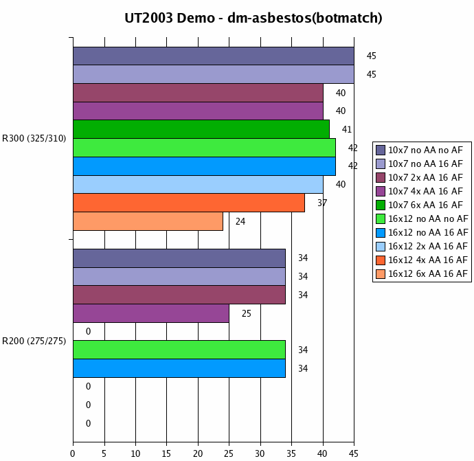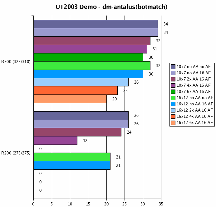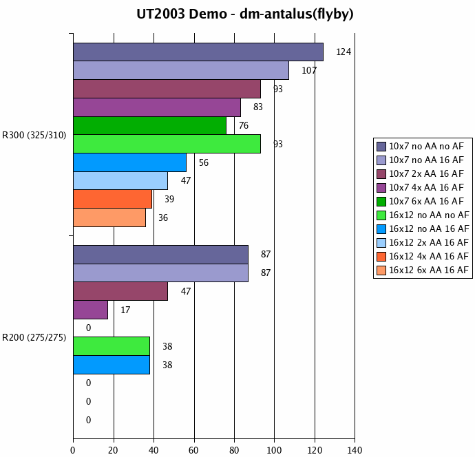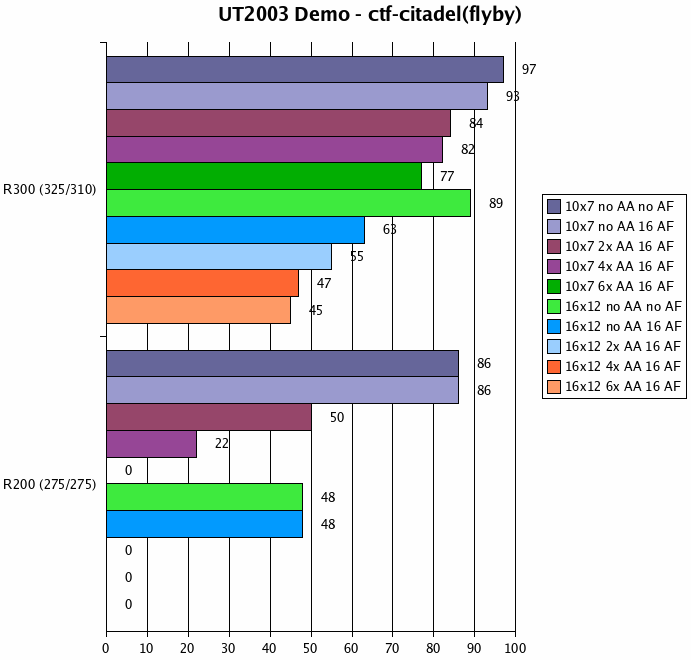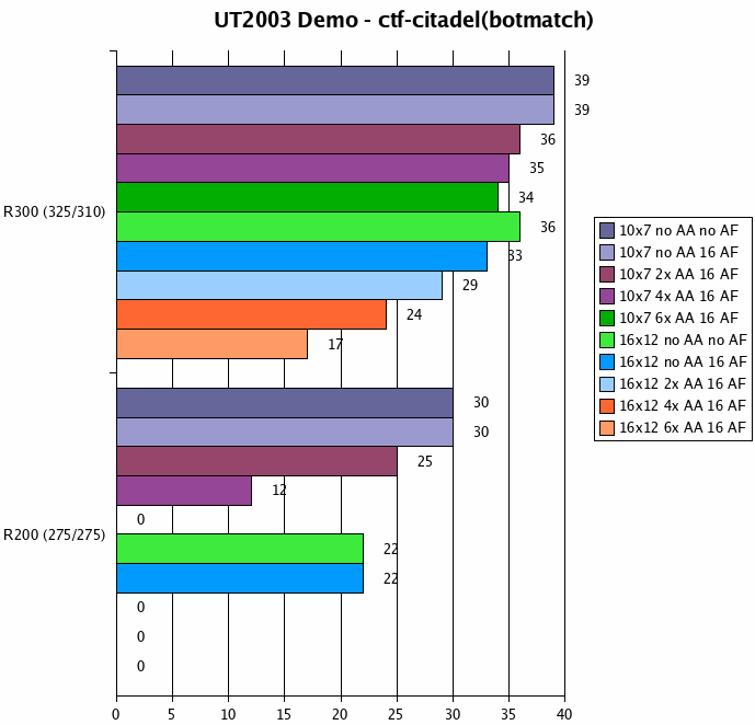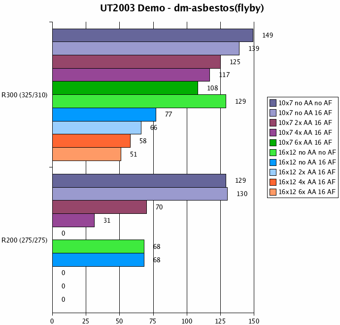 DirectX Benchmarks Unreal Tournament 2003 Demo ![]() Der anisotrophe Filter macht sich hier mit fast 40 % Leistungsverlust bemerkbar. ![]() Bei einem praxisorientierten Beispiel sinkt der Einfluß der Grafikkarte deutlich. ![]() Ein ähnliches Bild wie bei der vorangegangenen "flyby" Szene, FSAA kostet relativ wenig Leistung im vergleich zum aniso. Filter. ![]() Hier machen sich beim 6xFSAA die nur 128 MB der Radeon 9700 PRO negativ bemerkbar. Dazu eine kleine Rechnung: 1600*1200*(4(32 Bit Farbwerte im Frontbuffer) + 4*6(32 Bit Farbwerte im Backbuffer) + 4*6(32 Bit Z-Buffer))=95 MB, bleiben also noch 33 MB für Texturen und Geometriedaten. Mittels 3D-Analyze habe ich mal die VRAM-Auslastung gemessen: 1600x1200 ohne FSAA 34 MB, 4x FSAA 94 MB und bei 6x FSAA 125 MB, dort sind der Frontbuffer und eventuelle weitere Backbuffer (Triplebuffer) nicht enthalten. Mittels 3D-Analyze(unveröffentliche Version) veranlasste ich UT2K3 einen 16 Bit Z-Buffer zu verwenden. Die Framerate stieg von 24(125 MB VRAM-Auslastung) auf 33(102 MB VRAM-Auslastung), was deutlich normaler aussieht, im Vergleich zum "flyby" Modus. Somit ist die Radeon 9700 PRO eine der ersten Grafikkarten, welche durch ihre Leistungsfähigkeit und Features etwas unterdimensioniert (RAM-Größe) erscheint. Die vorhandene Z-Buffer und Backbuffer Kompression arbeitet verlustfrei, deshalb muss der R300 vom schlechtesten Wert (1:1) ausgehen und den gesamten RAM reservieren, obwohl dieser vielleicht nie benötigt wird. ![]() ATi's Z-Buffer und Backbuffer Kompression arbeitet sehr effizient, wie man bei dem geringen Unterschied zwischen 4x und 6x FSAA sehen kann. ![]() Hier fehlt eine leistungsfähigere CPU. Beim 6x FSAA wird die Radeon 9700 PRO wieder durch ihre 128 MB limitiert. |